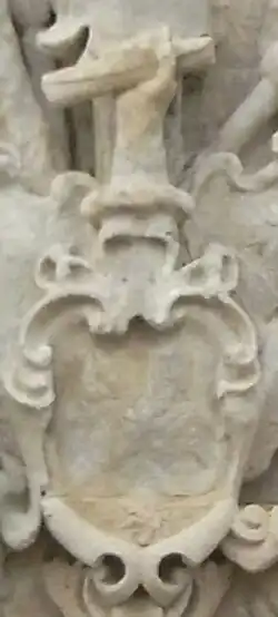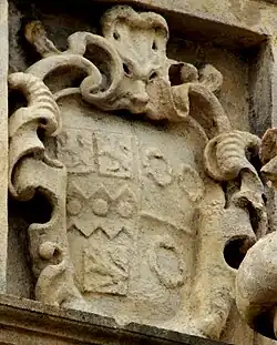 In 1708 Robert Rolle donated to the Corporation of Barnstaple, Devon, a large stone statue of Queen Anne, the victorious monarch of the recent Battle of Blenheim in 1704, which was placed atop the newly constructed Mercantile Exchange, which thenceforth bore the name Queen Anne's Walk. Underneath the statue, possibly intended to be free-standing and not on top of this building, is its original base, now seated somewhat incongruously above the Royal Arms. On the base is an escutcheon showing a cartouche with the arms of Rolle, now much worn, above which is the Rolle crest: A cubit arm erect vested or charged with a fess indented cotised azure in the hand a roll of parchment. On either side of the Rolle arms is a seated naked, disheveled and shackled French prisoner of war, behind whom is a centrally placed antique trophy of arms consisting of captured French weapons (two canon, muskets, a club, a halberd and a helmet etc.) and two lowered French standards on either side. The imagery is reminiscent of the sculptures of two French captives atop the central pediment of Blenheim Palace, built for the Duke of Marlborough, the victorious English commander at that battle. The original source for both is imagery from the classical world, as visible for example on Roman coins. On each side of the base of the statue of Queen Anne is an escutcheon showing the arms of Rolle impaling Duke, the arms of his wife. Immediately below the feet of the Queen is a tablet on which is inscribed the following Latin text: "Anna, Intemeratae fidei testimonium Roberti Rolle de Stephenstone in agro Devoniensi Armigeri MDCCVIII" ("Anne, a testament of the undefiled faith of Robert Rolle, Esquire, of Stevenstone in the land of Devonshire, 1708"). The gift of this statue appears to have prompted the Corporation to build the mercantile exchange, financed by a dozen or so of the leading merchants whose arms are sculpted within the frieze, on the quay now known as Queen Anne's Walk, on top of which sits the statue. The inscription was transcribed by the Devon topographer Rev. John Swete in his "Journals".[5]