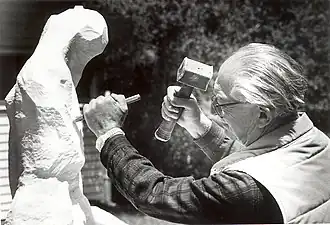 He won his first major commission in 1938 for two monumental bas-reliefs at the post office in Evanston, Illinois.[2] His sculpting skills garnered increased recognition, including a Ford Foundation Fellowship to work in Italy and study the Renaissance masters. The New York native continued to return to Italy during his life to "work on projects in the marble yards and foundries there."[2] Perhaps his best known work is a massive bronze bust of Abraham Lincoln, called the Abraham Lincoln Memorial Monument, which was originally dedicated in 1959 at the highest point on the Lincoln Highway in Wyoming.[1] Other roadside art includes his "The Greeting and the Gift" at the visitors' center south of Cheyenne.
