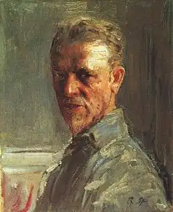 After leaving Pauwels' studio, he worked as a landscape painter and portraitist and, until 1904, operated a private painting school for women. In 1893, he became one of the founding members of the Dresden Secession. He was appointed a Professor at the Academy in 1906, where he taught until 1931,[1] and became an associate member of the Berlin Secession in 1909. From 1913 to 1930, he was a member of the Dresdner Galeriekommission and, from 1920, had a seat on the Gallery Advisory Board, both of which positions enabled him to help young artists. When Gotthardt Kuehl died in 1915, Sterl took over his Master Class. During World War I, he worked as a war painter, on the Western Front in 1915 and the southern front in the Dolomites in 1917.[1] After the war, he bought a house in Struppen and built a spacious studio there.