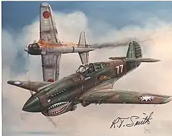 R.T. Smith (sometimes called "Tadpole"[3] after David Lee "Tex" Hill supplied the answer to a question someone posed to Smith, "What's the 'T' stand for?") saw his first combat action over Rangoon on December 23, 1941, when he was credited with shooting down 1.5 Mitsubishi Ki-21 "Sally" bombers, followed on Christmas Day with credit for two more Sallys and a fighter. Promoted to flight leader in the Third Pursuit Squadron, the "Hell's Angels", Smith was credited with shooting down a total of 8.7,[8] 8.9[9] or 9[1][10] Japanese planes, and was twice decorated by the Chinese government. The AVG continued to fight throughout Burma and southwest China until it was officially disbanded on July 4, 1942.[11]