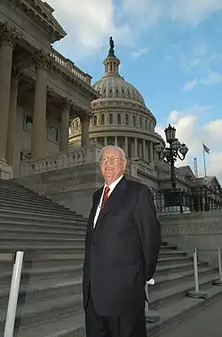 The House of Representatives passed a measure introduced by Representative John B. Larson, a former high school history teacher, directing the Librarian of Congress to facilitate the writing of a history of the House of Representatives. Remini was then asked by Librarian of Congress James H. Billington to write a Congressional history, The House: The History of the House of Representatives. Remini accepted the task and the book was published in 2006. The book was considered to be "nonpartisan, readable, and stocked with memorable characters." The work led to his appointment as Historian of the United States House of Representatives by Speaker Dennis Hastert on April 28, 2005.[4][7] He was 83 at the time of his appointment.[9] As House Historian, Remini was credited for his non-partisanship, especially after previous House Historians had been fired over partisan issues.[4] He enjoyed visiting the Library of Congress as House Historian. "He was like a kid in a candy shop," said his daughter, Joan Costello. "He was so tickled and thrilled to be able to read the rare books, documents and letters available to only a few."[9] He retired in 2010 and was succeeded by Matthew Wasniewski.[10]