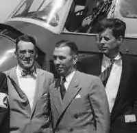 ![]() Robert W. Stoddard (left), City Manager McGrath and U.S. Senator John F. Kennedy before take-off in a helicopter at Worcester Regional Airport for inspection of areas devastated by the 1953 Worcester tornado. | |