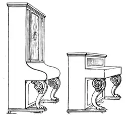 According to Loudon's Encyclopædia of Cottage, Farm, and Villa Architecture and Furniture Wornum exhibited a piano in 1833 "that could hardly be distinguished from a library table"[64] and by 1838 he offered patent double action piccolo uprights from 30 to 50 guineas, and cottage and cabinet uprights from 42 to 75 guineas ($350),[65] which the encyclopedia described were handsomely finished in the back and had "the same degree of tone and excellence...as the horizontal pianos"—the smallest and largest models being those "most frequently used"[64]— as well as 5 foot 4 inch long (163 cm) pocket and 7 foot 10 inch (237 cm)[41] imperial grands for up to 75 and 90 guineas ($420) respectively. He advertised that these reduced prices were in response to the success of his piccolo piano which had "induced certain manufacturers to announce and sell instruments of a different character under the same name, by which the public [was] deceived",[66] but by the following year offered more expensive versions of the larger models.[67] The new[68] 6-octave pocket and 6½ octave imperial grands followed the ordinary practice of positioning the strings above the hammers but were constructed with an entirely separate structure hinged at the spine from the lower part of the case so that the wrestplank, wood frame, sounding board and bridges were all placed above the strings,[41] forming a rigid uninterrupted construction similar to his uprights as well as what he would later use in downstriking pianos. These grands were furnished with tied double actions arranged like those of the uprights.[69][70]