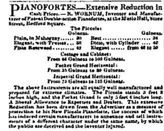 Wilkinson & Co. were successors to Broderip & Wilkinson, a partnership between Francis Broderip and George Wilkinson which had formed in 1798 following the failure of Longman & Broderip. Wilkinson & Co. was organized following Broderip's death in 1807.[5] According to the family history recorded by Wilkinson's son Henry Broadhurst Wilkinson, the firm had arranged to have tall cabinet upright pianos manufactured for them by Astor and "Leukenfeld" by license under William Southwell's patent. Southwell, who was said to have made the first cabinet upright in 1790,[6] described that it was "so constructed as to prevent the possibility of its being so frequently out of tune", and without "any opening or perforation between the sound-board and the pin block", although his 1807 patent only claimed a new arrangement of its dampers. The Monthly Magazine reported in May, 1808 that Wilkinson & Co. offered to the public "a New Patent, Cabinet Piano-forte", and described that its form was "as curious as convenient," occupying no more room than the smallest bookcase, while its tone was both brilliant and delicate, its touch "peculiarly facile and pleasant" and claimed the strength and simplicity of its construction would tend "to ensure its keeping in tune longer than most other instruments."[7] The Quarterly Musical Register described in early 1812 that by then these instruments were manufactured by other firms as well, and commented "whether they will be adopted as preferable to the square piano forte, time must shew."[8] Wornum's son Alfred later claimed that these instruments were unsuccessful for a time[9] and Broadhurst Wilkinson related that the firm had been obliged to furnish replacements under warrantee when the instruments sold by them were found not to "stand well."[10] By mid-1809, however, the firm advertised that owing to "the great increase of their manufactory of pianos" they had determined to close down their other musical enterprises, and had reduced their entire stock of music to half price and offered favorable terms on all instruments out on hire.[11]