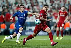 On 14 January 2018, Firmino scored in a 4–3 home win over Manchester City, which saw Liverpool end City's unbeaten league run.[52] On 27 January, Firmino scored and missed a penalty in a 2–3 defeat to West Bromwich Albion in the fourth round of the FA Cup.[53] On 14 February, Firmino scored in a dominant 5–0 away win over Porto in the first leg of the Champions League round of sixteen.[54] On 10 April, he scored in a 2–1 win over Manchester City in the second leg of the quarter-finals of the UEFA Champions League, which saw Liverpool advance to the semi-finals with a 5–1 aggregate win.[55] On 29 April, Firmino signed a new long-term contract with Liverpool.[56][57] Firmino started and played the whole 90 minutes in the 2018 Champions League final, with Liverpool losing 3–1 to Real Madrid.[58][59]