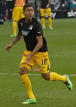 Firmino signed with TSG Hoffenheim in December 2010, with the contract running until June 2015.[11] He formally arrived at Hoffenheim on 1 January 2011.[12] Then Hoffenheim manager Ernst Tanner commented that they were "pleased to hire a Brazilian talent".[13] He made his debut a month after his signing in a Bundesliga defeat against Mainz 05, where he came on as a 75th-minute substitute for Sebastian Rudy. He scored his first goal for the club on 16 April, the only goal of a league victory against Eintracht Frankfurt.[14] He was dropped from the first-team squad along with Chinedu Obasi at the end of November 2011 for showing up late for training, missing the league match against Bayer Leverkusen.[15] He scored two more goals that season, against Wolfsburg and Borussia Mönchengladbach. In the 2012–13 season, Firmino made 36 appearances and scored seven goals in all competitions. In July 2013, Russian club Lokomotiv Moscow made a €12 million bid for Firmino.[16] Hoffenheim captain Andreas Beck hailed Firmino's development as "outstanding" in August 2013.[17] On 27 March 2014, Firmino extended his contract with the club, signing a three-year extension.[18] He finished the 2013–14 Bundesliga season tied as the fourth highest scorer with 16 goals,[19] and was named the league's Breakthrough Player.[20]