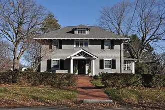The Roberts House is a historic house at 59 Prospect Street in Reading, Massachusetts. The two-story house is basically Colonial Revival in character, but also exhibits Craftsman style features, including extended eaves with exposed rafter ends, stucco walls, and a chunky entrance portico. The window above the entrance is a Shingle style band of three casement windows, and there is a hip-roof dormer in the roof above. The house is one of Reading's better examples of Craftsman architecture, and was built in 1911, during a building boom on the town's west side.[2]