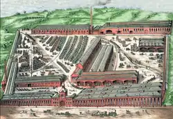 Robeys rapidly became an important employer in Lincoln and by 1865 were employing 114 men. The works covered a total area along Canwick Road of seven acres and around 1870 the name of Perseverance Ironworks was changed to the Globe Works. The layout of the works is shown in a print of 1879 The facade on the Canwick Road originally had a large entrance way surmounted by a tower. This may have been designed by the Lincoln architect William Watkins. Watkins had designed an extension to the factory in 1873. Watkins had also been architect for a large house built for Robert Robey, overlooking the nearby South Park. A new fitting shop had been added in 1871[21] In 1883 a Coffee Palace and Workmen Mess rooms were built on the opposite side of Canwick Road.[22] The main entrance on Canwick Road, surmounted with a globe above the door must date from about 1910. The site was developed over the next few years. A cooling tower was built in 1912 [23]