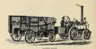 Robeys were in the forefront of traction engine development. The idea that a portable engine could be converted to drive itself under its own power evolved around 1859. The traction engine, in the form recognisable today, developed partly from an experiment in 1859 when Thomas Aveling modified a Clayton & Shuttleworth portable to become self-propelled by fitting a long driving chain between the crankshaft and the rear axle.[7] Lincoln manufacturers rapidly developed this idea. Robey's first design was to develop a traction engine steered by a man in front of the boiler. This was displayed at the International Exhibition of 1862 and the illustration shows the traction engine towing a thrashing machine. At the same Exhibition Benjamin Dutton Taplin who had an iron foundry by St Peter at Gowts in Lincoln, showed a traction engine of the form that became standard. Also in May that year a Traction engine described as Taplin, Robey and Co. was exhibited at the Bath and West Show. Taplin, who appears to have been too ambitious in the development of his business, had become insolvent at the end of May [8][9] and it seems likely that Robey had acquired his stock in trade. Robeys continued to produce traction engines that could be steered by a man at the front and a traction engine of this type was exhibited by Robeys at Manchester in 1869.[10]