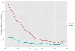 In Europe, although it is sometimes regarded as a feminine name, it is generally given to boys. In 2014, 88% of babies named Robin in England were boys.[3] In the United States, it used to be more popular as a feminine name. Around its peak popularity in 1956, it was the 29th most popular name for girls and the 143rd most popular name for boys.[2] The gender gap has narrowed as the name has become generally less popular.