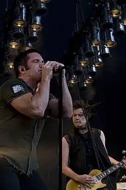 He uses a broad range of guitar amps (various models by Marshall Amplification and Mesa Boogie)[26] and effects (including the BOSS DD-5 Digital Delay, Dunlop wah-wah, Devi Ever bit, the legend of fuzz, and RockTron Vodoo Valve)[27] and is known to work very hard to re-create studio tones and textures when playing on stage.[28] He frequently shoves the body of his guitar up against the speakers of his amplifiers during live performances to generate feedback and increased distortion. For some NIN songs he has been known to use an e-bow, as seen during the clip for "La Mer" on the And All That Could Have Been live DVD.