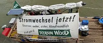 These actions include protests,[14] such as climbing or occupying buildings and displaying banners, as well as environmental education at public events or in schools. In addition, research and publications are published, and the ROBIN-WOOD magazine is issued quarterly. Current issues are presented on a self-built raft that has been travelling around Germany in recent years. In 2021, a raft tour from Berlin to Hamburg took place under the motto With tailwind for a real energy transition.[15]