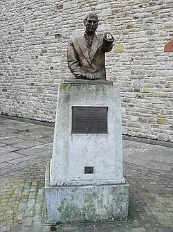 Robinson Mitchell was an English auctioneer who pioneered the auctioning system which is widely used today, as he realised taking bids from buyers was more efficient than the haggling between individuals which went on before. At Cockermouth in 1865, he set up what is believed to be the first purpose-built livestock auction market in the country. The business he founded moved their livestock operation out of town in 2002. Sainsbury's acquired the vacated site and paid for this statue, by sculptor Liz Gwyther, to be erected outside the supermarket. It has suffered persistent and expensive vandalism – a hand with a pointing finger has been lopped off the left arm, and a gavel prized away from the right. A photo of how the statue used to look can be seen on the Cockermouth website.[1]