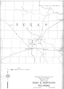 The Roby and Northern Railroad was constructed in 1915 to connect the agricultural community of Roby, Texas with a connection to the Missouri, Kansas and Texas Railway at North Roby, then known as Old Fisher, both located in Fisher County, Texas, a few miles north of Sweetwater. There was a need to move agricultural products (such as cotton)[1] passengers, and livestock the 4.5 miles (7.2 km) north to the Waco-Rotan branch of the MKT.