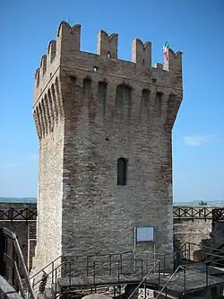 It was originally a watchtower. It has undergone several reconstructions between the 12th and 15th centuries and its current height (24 m/79 ft) is lower than it was initially. The top, currently crowned with Ghibelline merlons, was covered with a gable roof. The entrance to the keep was at a higher level than the ground, so that the only way to enter it was through a wooden ladder which could be removed in case of danger.