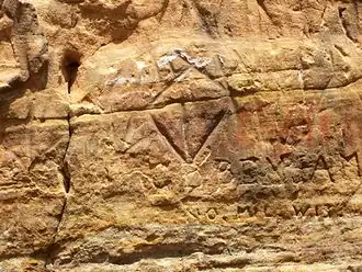 The Roche-a-Cri Petroglyphs, also known as the Friendship Glyphs, are a Registered Historic Place in Roche-a-Cri State Park, near Friendship, Adams County, Wisconsin. They consist of Oneota rock art, mostly petroglyphs resembling birds, canoes and geometric designs.[1] They were added to the National Register of Historic Places in 1981.[2] The petroglyphs were vandalized by soldiers and area settlers between 1845 and the 1880s, notably Company D of the Wisconsin 1st Cavalry Sharpshooters in 1861.[3][4]