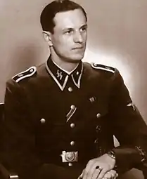 For the invasion of Poland in September 1939, his regiment was attached to the XIII Army Corps, a part of the 8th Army.[14] Near Warsaw on 24 September, he was one of four men selected by his company commander, then SS-Hauptsturmführer Wilhelm Mohnke, to negotiate the surrender of Polish troops during the Battle of Modlin.[15] He was picked because of his ability, although very limited, to speak Polish. After the negotiations failed, the Germans headed back to their lines. When they were about 80 metres from the fort, firing began.[16] Several rounds struck Misch, who fell down and lost consciousness. Some German soldiers carried him to an aid station. Later, he was transferred to two different hospitals.[17] Thereafter, he spent six weeks at a convalescent home.[17] For his actions, Misch was awarded the Iron Cross, Second Class.[17] As Misch was the last living member of his Lower Silesian family, Mohnke recommended him for the SS-Begleitkommando des Führers (Führer Escort Command; FBK).[18] This was made up of SS members, including men from the LSSAH, who were not serving on the front lines.[19]