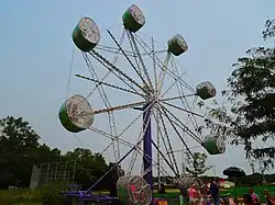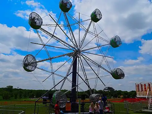 It is sometimes nicknamed "the cages" or "the eggs". Its shape is similar to that of a Ferris wheel, but with seats that are enclosed and rock and roll as the ride rotates. If the rocking builds sufficient momentum, the seats will flip upside-down and roll end-over-end. There is usually a manual hand wheel inside that the riders can use to lock the seat and prevent it from rocking. This can be used to make the ride less scary by ensuring that the seats do not rock too much; or to make it more intense by locking the seats at crucial points in the ride's revolution, causing the seats to flip upside down and spin erratically. The minimum rider height requirement is 36 inches.