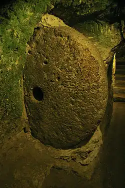 The underground cities were well designed for protection against attacks. The few entrances were hidden by foliage and not easily spotted from outside. Inside, they took the form of a labyrinth of passageways which were unnavigable for outsiders, and could be sealed with large rock doors, around a metre high and shaped like mill-stones. These doors were built such that they could be rolled into a closed position relatively easily, but could not be moved from the outside. They had a hole in the centre which was probably used as a kind of peephole. In some cities there were holes in ceiling above, through which the enemy could be attacked with spears.[6] The cities descended up to twelve stories – over 100 metres – under the ground and had everything necessary for a long siege. The upper stories were largely used as stables and storerooms, with a constant temperature of around 10 °C. In the walls of the caverns there were receptacles for various kinds of food, as well as hollows for vessels in which liquids could be stored. Further down, were the living and working spaces, where furniture, including seats, tables, and beds were carved out of the rock. Working spaces include a wine press at Derinkuyu, a copper foundry in Kaymakli, as well as cisterns and wells which ensured a supply of drinking water during a long siege.[9] There were also prisons and toilets.