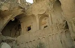The many churches in Cappadocia range from single, completely undecorated rooms in the underground cities that can only be identified as religious spaces by the presence of an altar stone, through cross-in-square churches, to the three-aisle basilica. They are all strongly shaped by Byzantine church architecture.[12] Most have a cross-shaped groundplan, one or more cupolas, barrel vaults or combinations of all these elements. The key difference from built church architecture is the fact that the builders were not constructing a structure and had no need to plan supporting walls and columns since they only had to carve out the rooms from the existing rock. Nevertheless, they incorporated elements from traditional architecture, like columns and pilasters, although they did not actually serve any load-bearing function. The furniture of the churches, including the altars, pews, baptismal fonts, choir seating, and choir screen, were carved out of the rock in most cases.[12] On the outside, the churches are often visible from far away as a result of facades with blind arcades, gables, and columns.