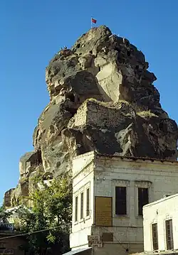 Mount Erciyes south of Kayseri, Mount Hasan southeast of Aksaray, Mount Melendiz in Niğde, and some smaller volcanoes covered the region of Cappadocia with a layer of tuff stone over the course of a twenty million year period ending in prehistoric times, after which erosion created the well-known rock formations of the region.[1] The process is a special form of the rill erosion which affects much of Turkey, in which the solidity of the volcanic tuff and ignimbrite creates particularly deep and steep-sided streams, which create tower-like shapes were they meet at right angles.[2] Since this soft stone is comparatively easy to work, people were probably carving it into dugouts by the early Bronze Age. In the course of time, this progressed to living complexes, monasteries, and whole underground cities. Since 1985, the 'rock sites of Cappadocia' have been a UNESCO World Heritage Site.[3]