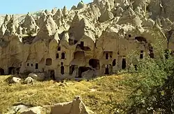 From traces of settlement it is known that the region of Cappadocia was inhabited in prehistoric times. Whether rock-cuttings had already been made at that time is not clear. It is probable however that in the Bronze Age at the latest, when the region was in the middle of the Hittite empire, the first passageways and rooms had been cut into the rock, as well as reservoirs and possibly even refuges in the cliffs.[4] In Derinkuyu underground city, only one tool of Hittite origin has been found and it might have been brought there at a later date.[5] The earliest attestation of these structures is in Xenophon's Anabasis, which mentions people in Anatolia who had built their houses underground.[6][7]
