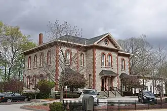 The Rock Castle School is a historic school building on Prospect Street in Webster, Massachusetts. The two story masonry building was built in 1871, and was Webster's second high school building. It served that purpose until 1905, after which it intermittently served a variety of public and private educational purposes until 1972. The building has Italianate styling, with high and narrow round-arch windows, and a projecting central pavilion that has a gable end with an oculus window. The building is predominantly light shades of polychrome granite, with brick quoining.[2]