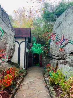 Rock City features a 4100-foot walking[4] trail lined with gardens containing hundreds of labelled local trees and plants. The trail also leads through a variety of unique and bizarre rock formations, including the 1,000 short tons (910 t) Balanced Rock and Fat Man's Squeeze. Two other sections, the Fairyland Caverns and Mother Goose Village, are rock caves decorated with blacklight-responsive sculptures. Other attractions include Standing Stone Gardens, Rainbow Hall, Swing-a-long Bridge, Stone Bridge, Cave of the Winds, Sky Bridge, Needle's Eye, and Goblin's Underpass.[5]