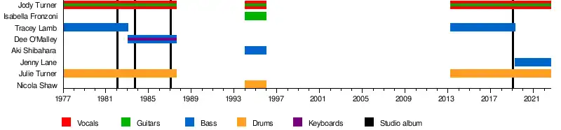 - Julie Turner – drums (1977–1987, 2013–2022)