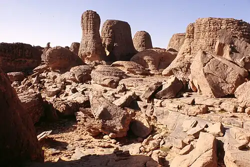 The Djerat wadi is a cañon dug in the Tassili siluro-devonian sandstones which runs between very steep cliffs. It flows into the valley of Illizi, about a hundred kilometers from the Libyan border. The wadi is on average 200 meters wide, its cliffs varying from 25 to 30 meters high at the outlet, reaching 150 meters towards the palm grove of Nafeg and reducing towards its sources. It receives many tributaries, including the wadis Afar and Assahor, which provide a large volume of water at the time of rains.[7] The two banks of the wadi are covered with engravings over a distance, according to the maps published by Lhote in his work, of nearly twenty kilometers.
