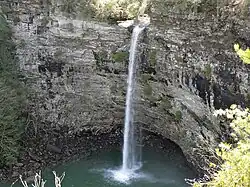 Rockhouse Falls, is a 125 feet (38 m) plunge waterfall that marks Rockhouse Creek's confluence with Cane Creek. The waterfall, which shares a plungepool with Cane Creek Falls, is visible from the Gorge Trail and from the base of the Cane Creek Gorge. The falls are located near Spencer, Tennessee in Fall Creek Falls State Park.[1]