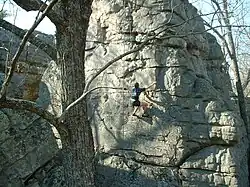 Rocktown, Georgia is the colloquial name for an outcropping of sandstone boulders on the Appalachian Plateau in northwest Georgia. It consists of several acres of large sandstone boulders; the average size is 30 to 40 feet (9.1 to 12.2 m) high. Every boulder has its unique features, all with great foot and hand holds, and are very popular with climbers. The area presents challenges for all levels of climbers. There is a one-mile hike from the trailhead to get to the Rocktown area. Most of these boulders are untainted by pollution and graffiti because it is in a remote part of northwest Georgia. However, in recent years as the climbing community has become increasingly aware of the area it has become more common to see trash, human waste, damaged or abandoned climbing gear, and vandalism. Because it is located in a wildlife management area, it is possible to encounter wild animals in this area, including both venomous and non-venomous snakes, bobcats, deer, wild turkeys, and black bears. When climbing and exploring the boulders, caves, and grottoes, it is common to encounter wasps, yellow-jackets spiders, and even the occasional bat. "Rock Town" refers to the large outcropping approximately one(1) mile from the trailhead. Which opens into a large gallery with 5 main pathways. This area has hundreds of spectacular formations, the entrance to a large cave, and 2 natural springs.