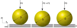 The Rockwell hardness test is a hardness test based on indentation hardness of a material. The Rockwell test measures the depth of penetration of an indenter under a large load (major load) compared to the penetration made by a preload (minor load).[1] There are different scales, denoted by a single letter, that use different loads or indenters. The result is a dimensionless number noted as HRA, HRB, HRC, etc., where the last letter is the respective Rockwell scale. Larger numbers correspond to harder materials.