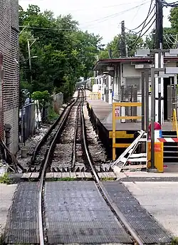 Rockwell is a surface level station with a single entrance/exit situated at 4648 North Rockwell Street between Leland Avenue and Eastwood Avenue in the Lincoln Square neighborhood of Chicago.[2] The area surrounding the station consists of mostly residential single family homes or two-flats, with a small neighborhood shopping district flanking the station entrance on Rockwell Street.[3]