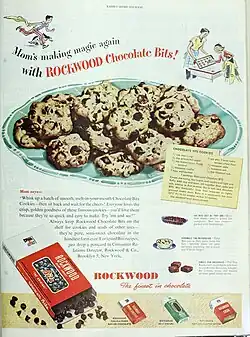 Wallace T. Jones and W. E. Rockwood founded Rockwood & Company in 1886 and originally operated a chocolate factory on Cherry Street in Manhattan until 1904, when it moved to Brooklyn. At the time, it was the second largest producer of chocolate in the country, next to Hershey's.[1] It processed raw cocoa into chocolate and made coatings, bars, cocoa, baking chocolate, and other confections.[2][1] Rockwood may have been the first to introduce chocolate sprinkles (marketed as "Decorettes") to the United States circa 1915,[3] and in the mid-1950s its bestselling product was chocolate chips (marketed as "Chocolate Bits").[4]