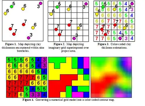 Once a grid has been established, the clay thicknesses at the center of each grid node are estimated. These estimations are based on a weighted average of the values associated with the surrounding control points (Figure 3). A variety of interpolation methods or “algorithms” are available for performing these estimations. A popular and simple technique called inverse distance weighting (IDW) varies the influence of surrounding points based on the inverse of the distance between the control point and the interpolated point. Another technique, called Kriging varies the influence of surrounding points based on a statistical analysis of their relative distance and direction.