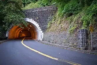 In 1934, the Rocky Butte Scenic Drive Historic District was established.[3] Built as part of a Works Progress Administration project[46] that supported 25,000 employees in Portland,[47] it was designed by the Multnomah County Road Department,[2] The drive reaches the summit of Rocky Butte to a viewpoint overlooking Portland. Workers used basalt from the Rocky Butte quarry to create retaining walls, and the finished project was designed to have a rustic style typical for public works projects of the time.[46] WPA workers also built the park and a baroque staircase at the top of Rocky Butte, finishing construction in 1939.[48] At its peak popularity in the 1940s, Rocky Butte had more than 4,000 cars visiting each day. Over time, the park had far fewer visitors and fell into disrepair. During the 1970s, the summit became a frequent site for teenage parties; excessive littering, graffiti and vandalism were commonplace. In the early 1990s, the Rocky Butte Preservation Society began cleaning up and restoring the park area and adding new amenities.[48] Once 5.5 acres (0.022 km2) of land were added and the Preservation Society took on an active maintenance role, the site was regraded, original plaques were reinstalled, and lawn areas, irrigation, red cinder walkways and additional trees, flowers, shrubs and grass were added to the park.[49] The District was listed on the National Register of Historic Places in 1991.[3] Other WPA projects included a tunnel 375 feet (114 m) in length at the southern end of Rocky Butte.[50] Built between 1939 and 1941, it was constructed to improve access to scenic views on the Butte. The project took 16 months to complete, and workers used hand mining and drill and shoot methods to excavate layers of cinders and lava flows. The tunnel is curved because of the volcano's 5 degree grade. Rocky Butte basalt was used to build the Rocky Butte Tunnel as well as the nearby West Burnside and NW Cornell Road Tunnels, all of which were constructed by the mason R. Curcio and his crew.[51] In total, the WPA's Rocky Butte project cost $500,000 to complete.[48]