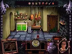 Rocky Interactive Horror Show is a point-and-click adventure game developed by On-Line Entertainment in conjunction with Transylvania Interactive and published by On-Line exclusively for Microsoft Windows.[3] A spiritual successor to CRL Group's 1985 video game adaptation,[4] it is the second video game to be released and based upon creator and star Richard O'Brien's musical of the same name.[5] Following the plot from 20th Century Fox's 1975 musical horror comedy film of the same name, the player assume the role of either Brad Majors or Janet Weiss in order to rescue one of the two playable characters, who has been transformed into stone by Dr. Frank-N-Furter's Medusa Transducer, within a set time limit before the mansion becomes a spaceship and takes off to the planet Transsexual Transylvania.[1][6]