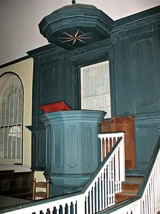 The Church's pulpit is circular in form and positioned above the pews giving the speaker full view of the congregation. Above the pulpit is an oval-shaped canopy or sounding board.