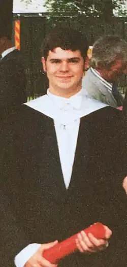 In September 1984 he began a three-year MA General Arts degree at the University of Edinburgh. Modules included those delivered by the School of Scottish Studies in George Square, while Hamish Henderson was still teaching there.[2] For those three years he lived in Pollock Halls of Residence, on the ground floor of Lee House (room G07).