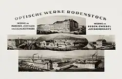 The company was founded in Würzburg, Germany by Josef Rodenstock under the name Optisches Institut G. Rodenstock in 1877.[2] The company produced barometers, ophthalmic lenses and frames, scales, and various measuring instruments in its precision mechanics workshop. In 1880, Rodenstock developed his first patented products, the "Diaphragma lenses", and two years later he exported them to Austria, Switzerland, the Netherlands, Denmark, Italy and Russia. From 1883 onwards, the company was based in Munich, and a grinding shop was established in Regen in 1898. In 1899, Rodenstock started production of the first sunglasses with UV protection. In 1886, he acquired the Rodenstock company grounds at Isartalstraße (today's Dreimühlenviertel). When Josef's son Alexander Rodenstock joined the company in 1905, Rodenstock's entire production was moved to Munich.[3]