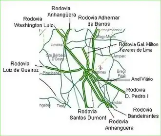 - SP-348: Rodovia dos Bandeirantes, from São Paulo City to Campinas and there to Hortolândia, Santa Bárbara d'Oeste and Cordeirópolis, connecting to Rodovia Washington Luís.