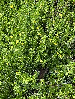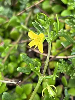 Coast twin-leaf is a perennial herb with stems that spread over the ground. The stems are branched and 20–40 mm long. The leaves are Y-shaped, with blunt tips, and up to 15 mm long. The flowers are yellow and about 10 mm long. The fruit is a drooping four-angled capsule about 10–12 mm long, containing brown seeds.[2] It is a scrambling plant which is found in both sheltered and exposed coastal sites where it stabilises loose sand on dunes.[3]