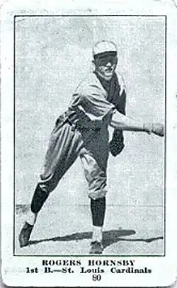 Hornsby started playing baseball at a very young age; he once said, "I can't remember anything that happened before I had a baseball in my hand."[2] He took a job with the Swift and Company meat industry plant as a messenger boy when he was 10, and he also served as a substitute infielder on its baseball team.[3] By the age of 15, Hornsby was already playing for several semi-professional teams.[4] He also played baseball for North Side High School until 10th grade, when he dropped out to take a full-time job at Swift.[5] While he was in high school, Hornsby also played on the football team, alongside future College Football Hall of Famer Bo McMillin.[5]