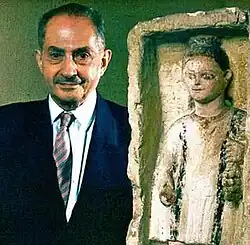 In 1955, Khawam took over the family business. He developed an extensive network of contacts that brought him new finds including farmers who found things in their fields and he toured archaeological digs looking for new pieces. He became an expert at spotting fakes. He told his sons to always look at the object, not the hand that held it. Customers included the Louvre, the Metropolitan Museum of Art and the Queen Mother and her ladies-in-waiting.[1] He was a member of the Egypt Exploration Society and the Société Française d'Egyptologie.[2]