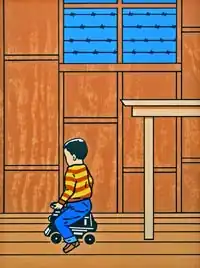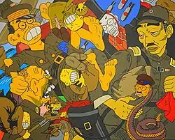 Shimomura's paintings often take stereotypical American images of Asians: glowering, buck-toothed wartime "Japs", Fu Manchu, subservient geishas, martial artists, and skewer them through over-the-top exaggeration or juxtaposition with images of idealized American society. Pop culture icons such as Mickey Mouse, Coca-Cola, and Pikachu appear incongruously in bright, flat-perspective landscapes, sometimes with absurdly altered portraits of Shimomura himself.[6][7] His more subtle works often combine traditional Japanese woodblock printing with impressions of the incarceration camps, taken from both his own youthful memories and passages from the diary that his grandmother Toku kept for many years.[4]