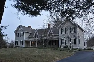 The Rogers–Downing House is a historic house in Andover, Massachusetts. It was built between 1848 and 1852 as the country house for Benjamin Rogers, a wealthy Boston businessman. After Rogers sold it in 1870, it went through a succession of owners before coming into the hands of John Downing, who established a dairy farm and orchard on the estate. Their family retained the house until 1968. The house is an unusual example of a Gothic Revival summer house. Its shape is that of an H, with two 2+1⁄2-story wings connected by a 1+1⁄2-story connecting section. The gable ends of the side wings face the street, as do two gable dormers on the cross section. These are decorated with bargeboard trim, a typical Gothic Revival detail. The house sits prominently on a rise above Highland Road.[2]