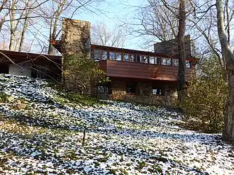 The original house was completed in 1951 and expanded in 1956.[3] It is placed on a hill because Wright wanted the building to be "of the hill", as if it had grown organically.[2] The original structure had one bedroom, a study and a kitchen and a total of 1,800 square feet (170 m2), while the addition covers 1,400 square feet (130 m2). The entrance is dominated by a dramatic wood cantilevered carport, which leads to an impressive yet unpresumptuous low-slung house with cypress paneling and indigenous stone.