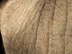 The structure of the skin of the patagia and accessory areas for the patagia of a Ptychozoon kuhli, flying gecko, exhibiting the passive gliding mechanism consists of five layers; a layer of adipose tissue is surrounded by a layer of dermis on each side (ventral and dorsal) and a layer of epidermis is external to the two dermal layers. The distribution of the adipose tissue IS thickest close to the body wall. This thick layer of adipose tissue at close to the body wall is believed to provide a "safety factor" for the structural elements of the skin (i.e. collagen fibers) near the body wall.[16] The thick layer of adipose tissue is more compliant than the structural elements of the body wall (i.e. ribs, muscles), therefore will more readily deform (absorb force) before the structural elements of the skin experience a force. The layer of adipose tissue also aids in the creation of the domed and cambered shape of the patagia. With regards to the structure of the dermal layer of the patagia, there is a thick layer of collagen fibers oriented parallel to the axis of the patagial ribs.[16] These collagen fibers act as the structural support for the shape of the patagia, and provide the stiffness necessary to resist shape change. The most prominent features of the epidermal layer of the patagia are the scales. The morphology of the dorsal scales of the patagia change as a result of their functional role. A large portion of the dorsal scales of the patagia are arranged in regular rib-like pattern, which guide the flow of air and allow for the lizard to behave as an airfoil.[16] However at the hinge joints (places where patagia folds and attaches to limbs), the regular rib like structure of scales breakdown into a more random distribution of scales. This breakdown of scales is believed to aid in the mechanical loading of the patagia during the unfurling process and also determining the extent the patagia unfurling during flight.[16]