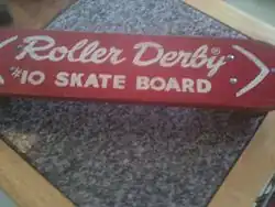 The Roller Derby Skateboard was the first mass-produced skateboard, sold by the Roller Derby Skate Company as a "Skate Board" (without the "#10"). Roller Derby made this skateboard in their La Mirada, CA factory, and it was available nationwide at Roller Derby arenas in 1959,[1] and then in Thrifty Drugstores and Sears, Roebuck and Co. as the "Roller Derby Skate Board" in 1960. It was very similar to the first commercially available skateboard; the red, flat, straight-sided, steel-wheeled "Bun Board" which had been made and sold in Hermosa Beach by Alf Jensen since 1957.[2] In 1964 Roller Derby added 3 surfboard-shaped rubber-wheeled models similar to Makaha skateboards produced in 1963. These three skateboards were produced in their Litchfield, Illinois plant.[3]